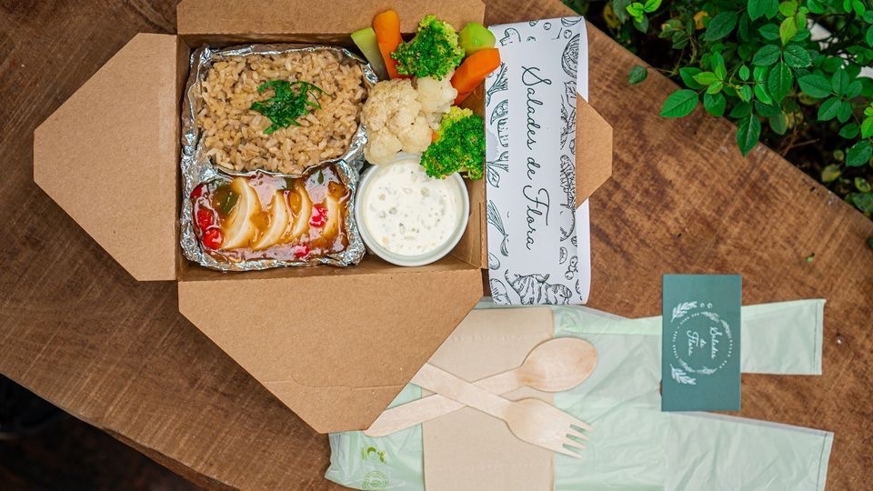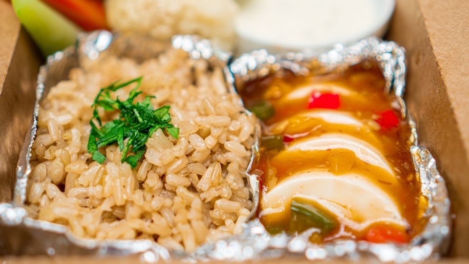 cơm gạo lứt séng cù, đậu phụ non Nhật Bản, xốt từ nước dùng rau củ có sa tế chay , ớt chuông,... rau củ hấp chấm xốt tartar