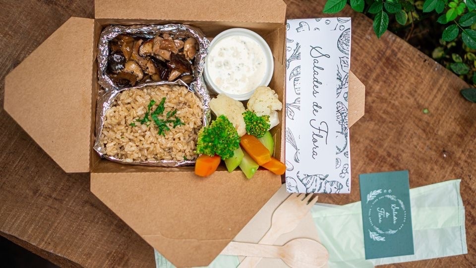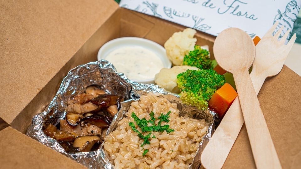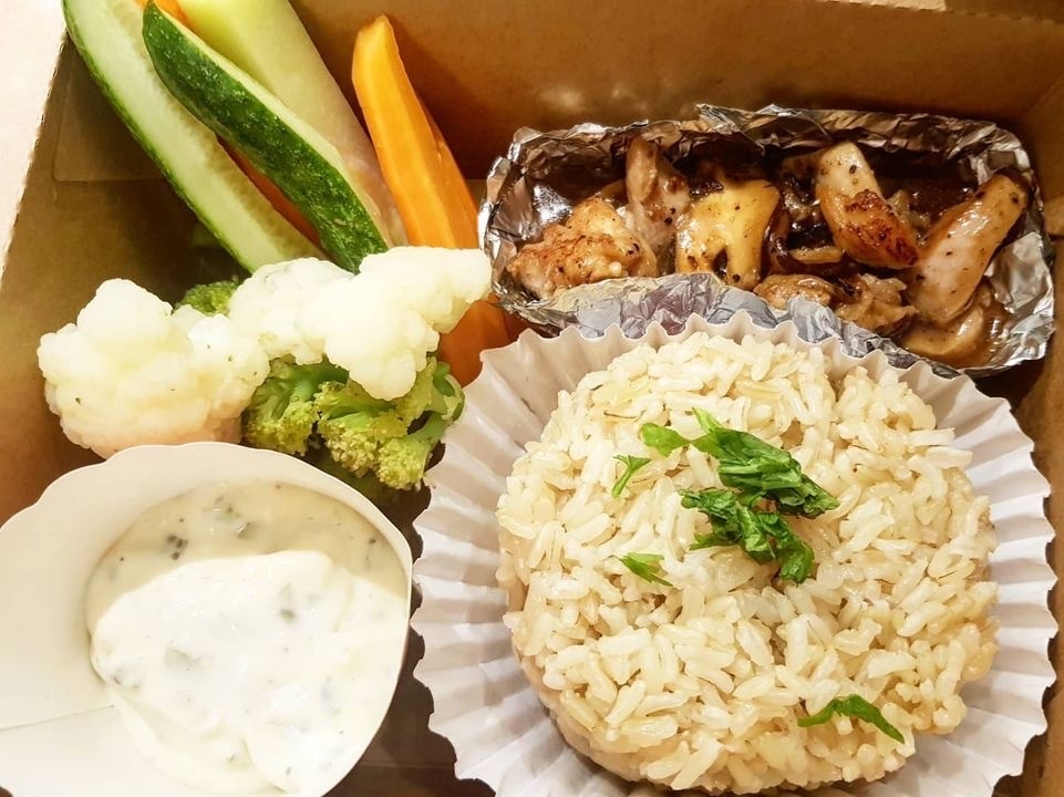 cơm gạo lứt Séng Cù, xốt từ nước hầm xương và 3 loại nấm, có thể chọn phần thịt ức hoặc má đùi gà, rau củ hấp chấm xốt tartar